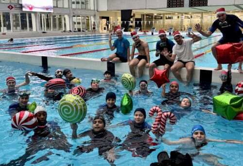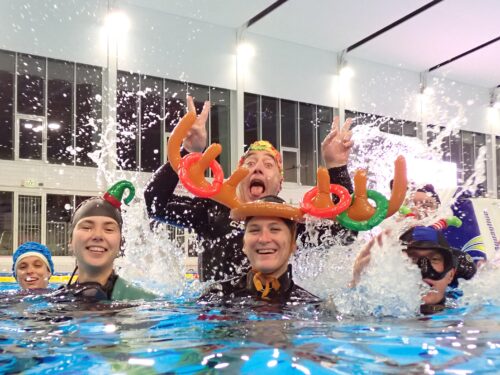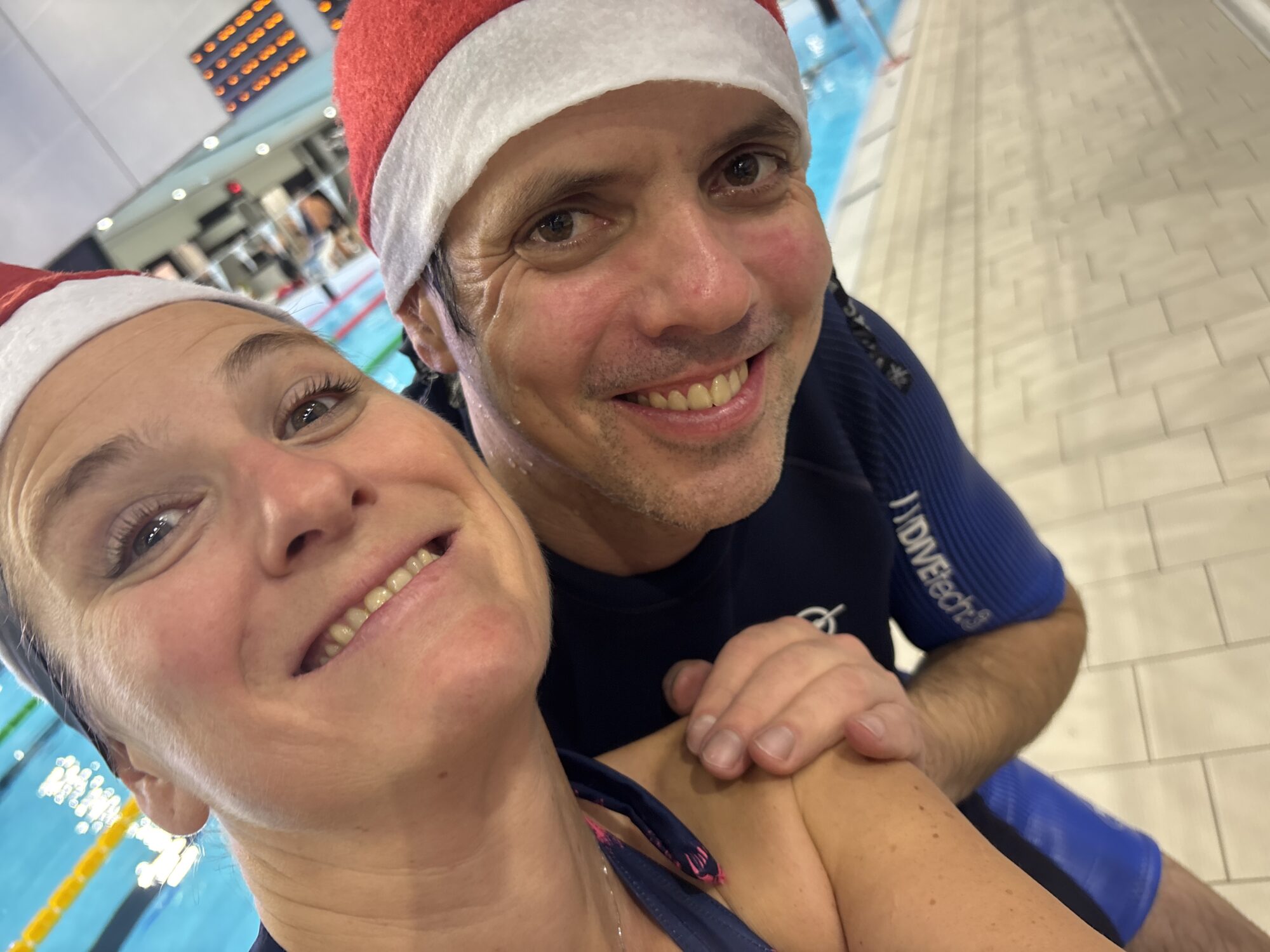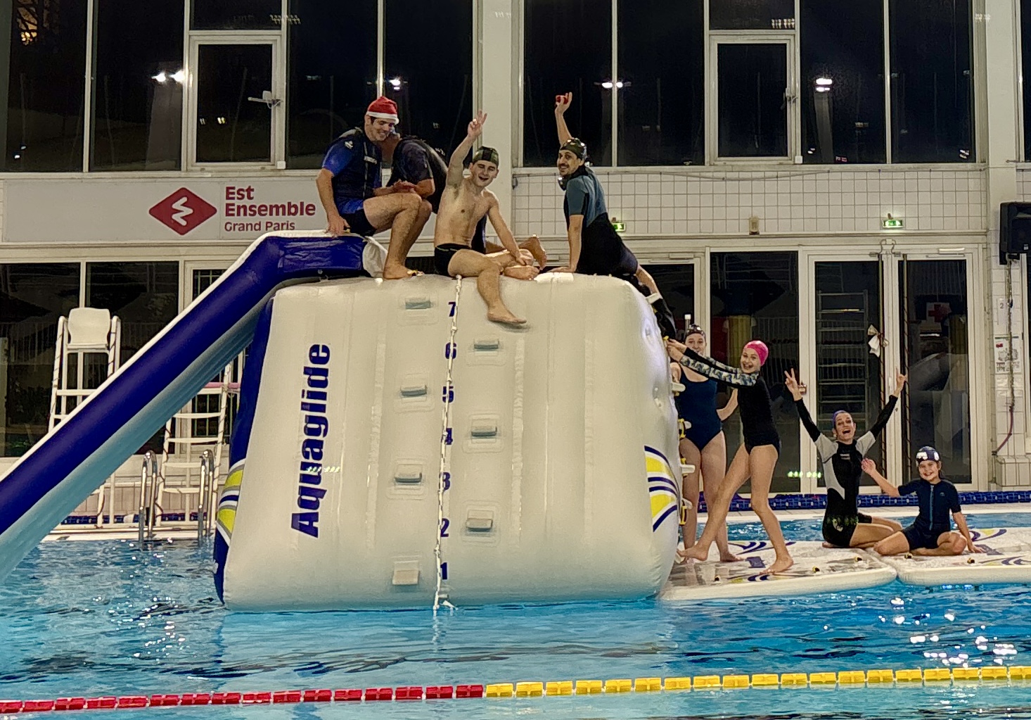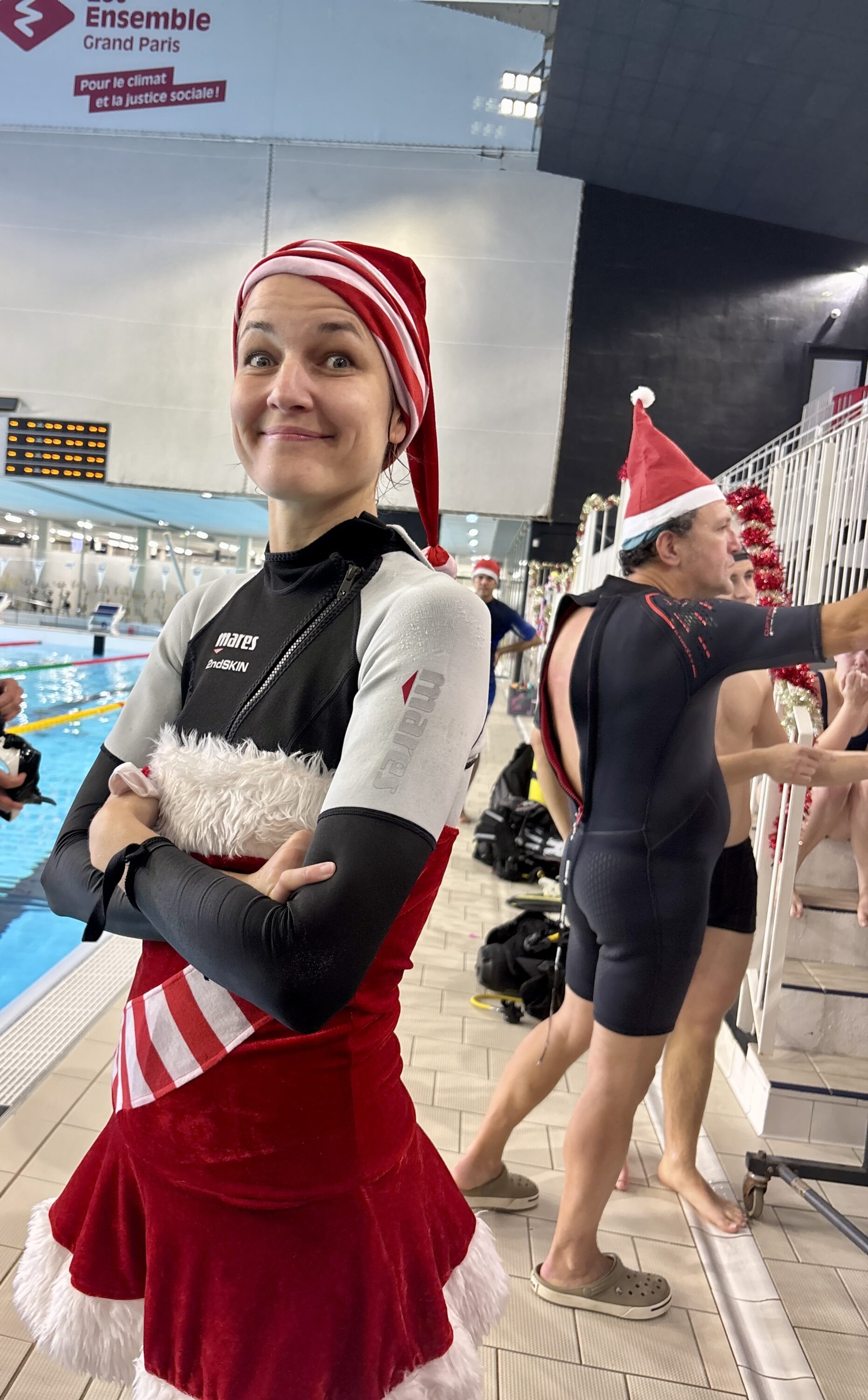 Dès l’échauffement, l’esprit de Noël était palpable : course de traîneau du Père Noël, relais de cadeaux et « bois de rennes » ont mis les plongeurs au défi tout en créant une atmosphère conviviale. La super structure du stade nautique Maurice Thorez a également été un terrain de jeu idéal pour se lancer dans des activités pleines de rires et de bonne humeur.